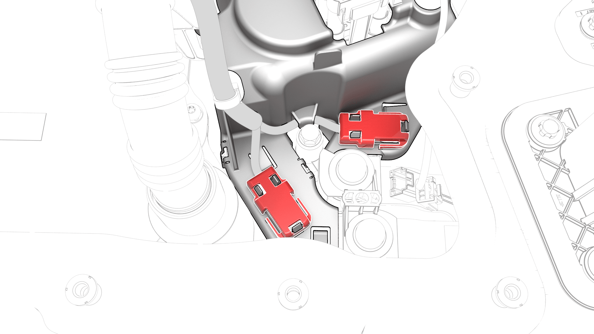 - Install the AC inlet terminal covers over the positive and negative ring terminal bolts, and fasten the clips that attach the AC inlet terminal covers to the HV battery fast charge contactor cover.