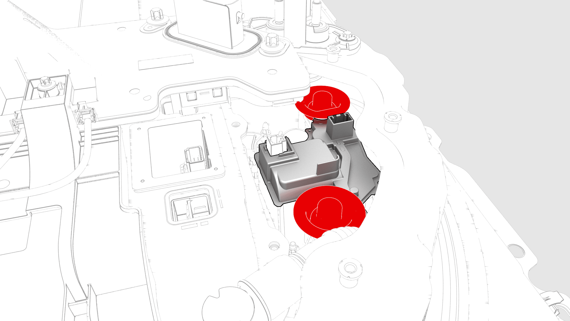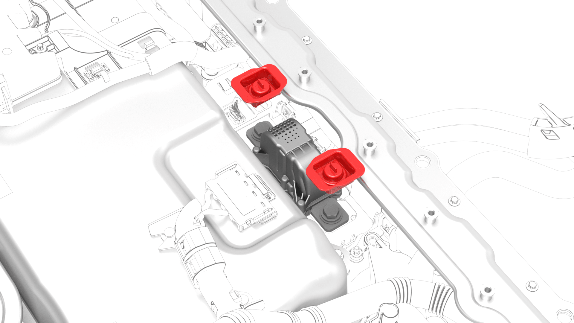 - Install the round insulator caps onto the HV battery negative contactor busbar bolt heads.