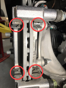 - Remove the LH rear brake caliper bracket abutment clips (x4).