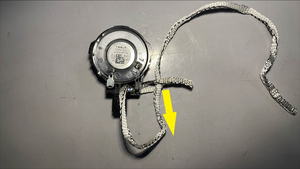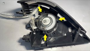 Release the clips (x3) that attach the LH front door tweeter to the carrier assembly, guide the tether through the guide, and then remove the tweeter from the carrier.
