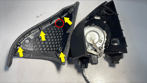 - Release the clips (x4) that attach the LH tweeter cover to the tweeter carrier assembly, and then separate the cover from the carrier.