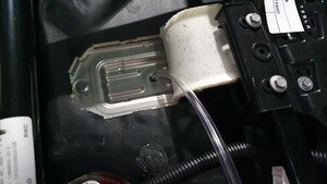 Remove bolt securing frunk to washer fluid reservoir neck