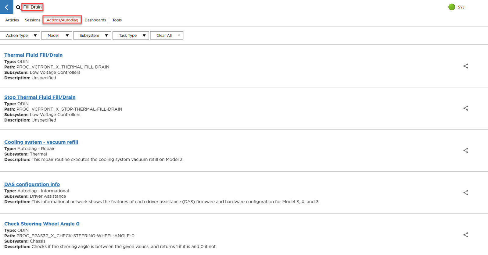 - Select ‘Actions/Autodiag’ tab and search for ‘Fill Drain’