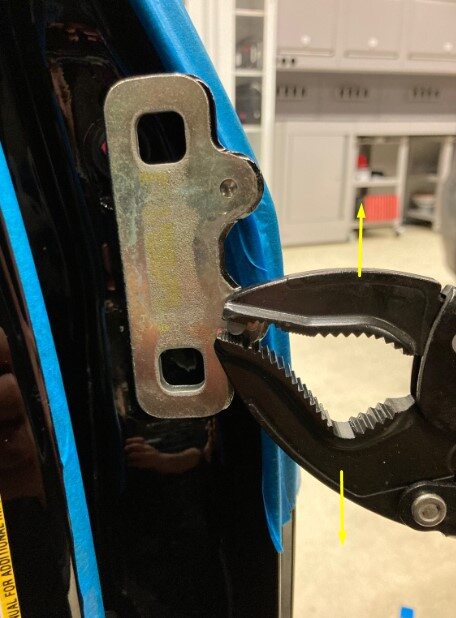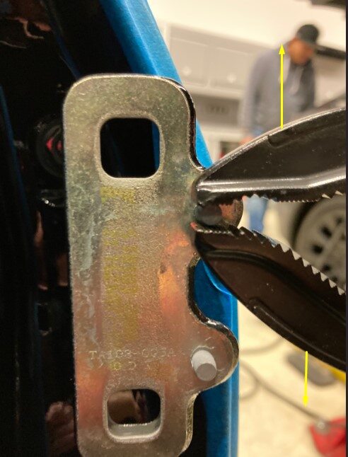 NoteRemove the guided pins (x2) out of LH rear upper door hinge using locking pliers (1115178-00-A or similar).NoteRotate the pins during removal.