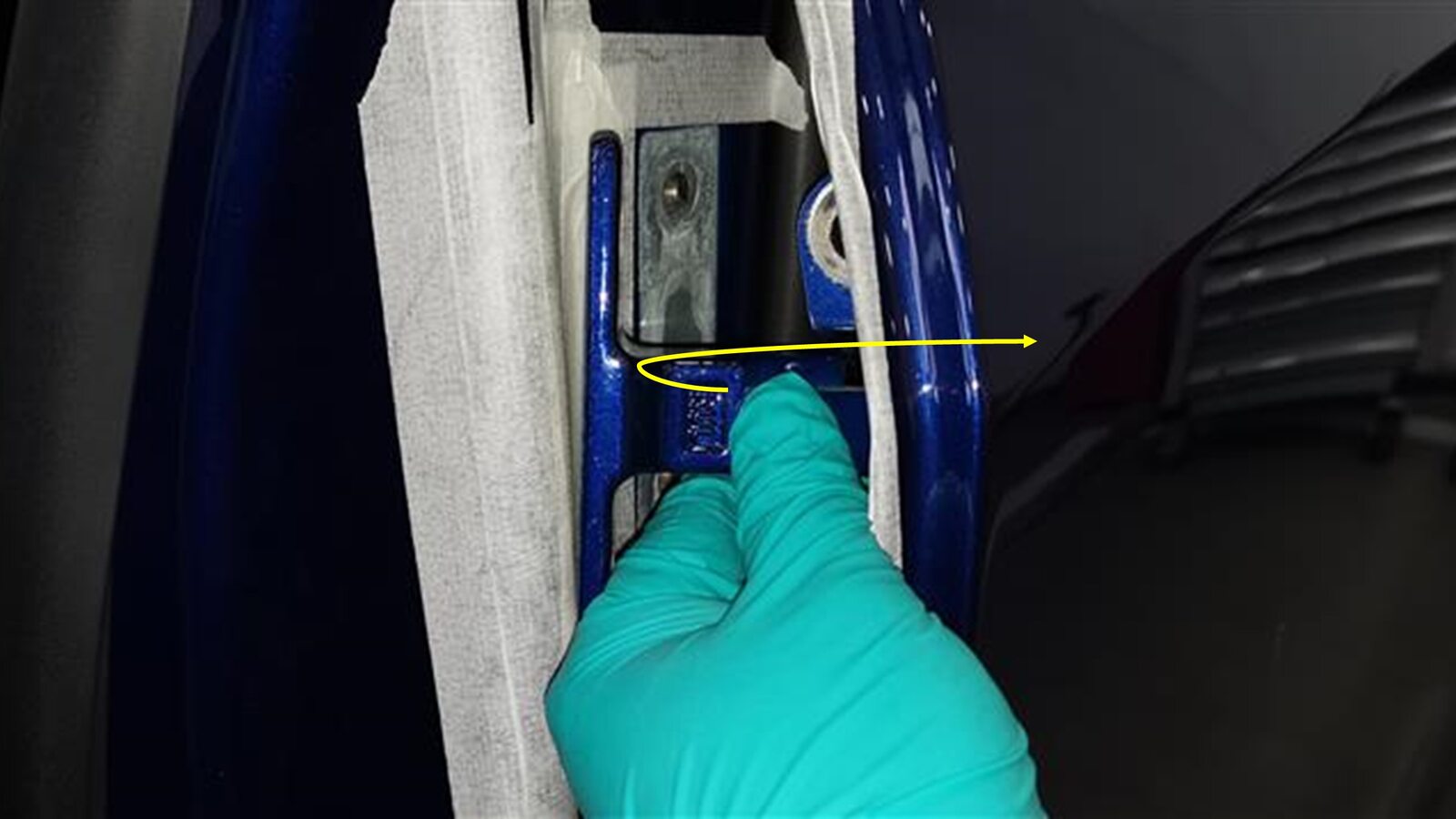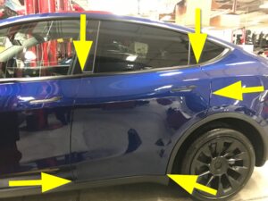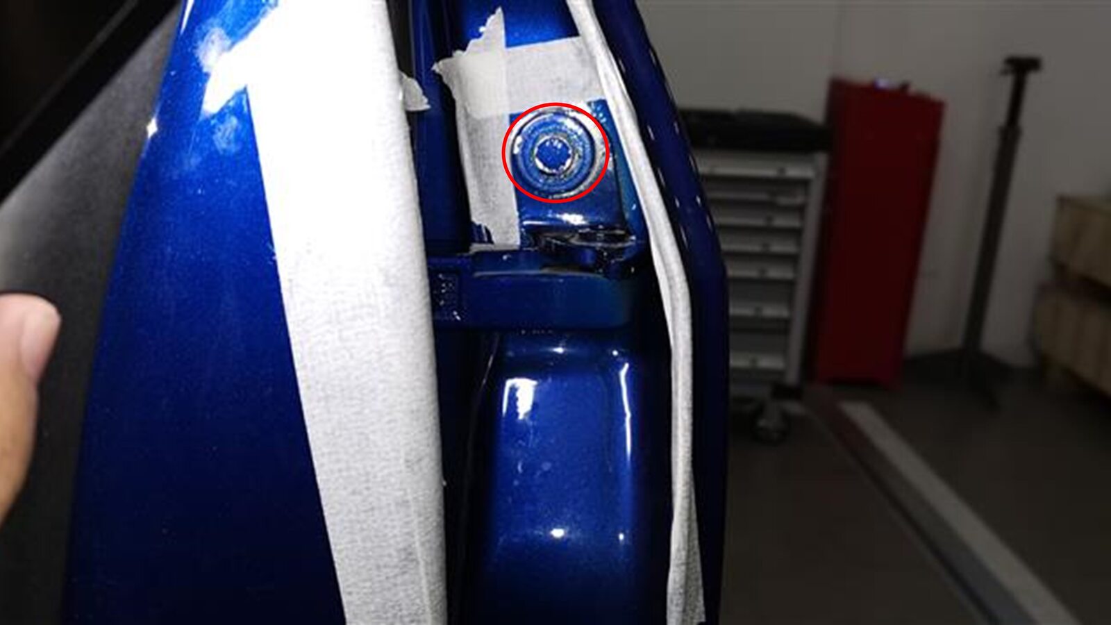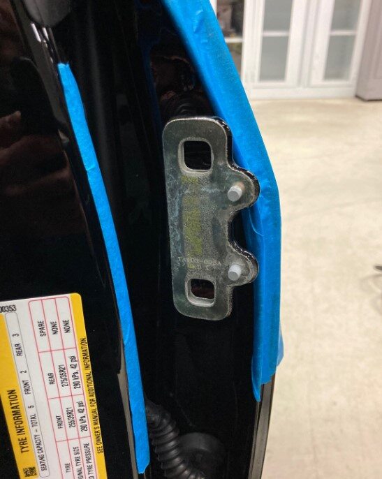 - Remove the tape from the LH body side and door side of the upper hinge location.