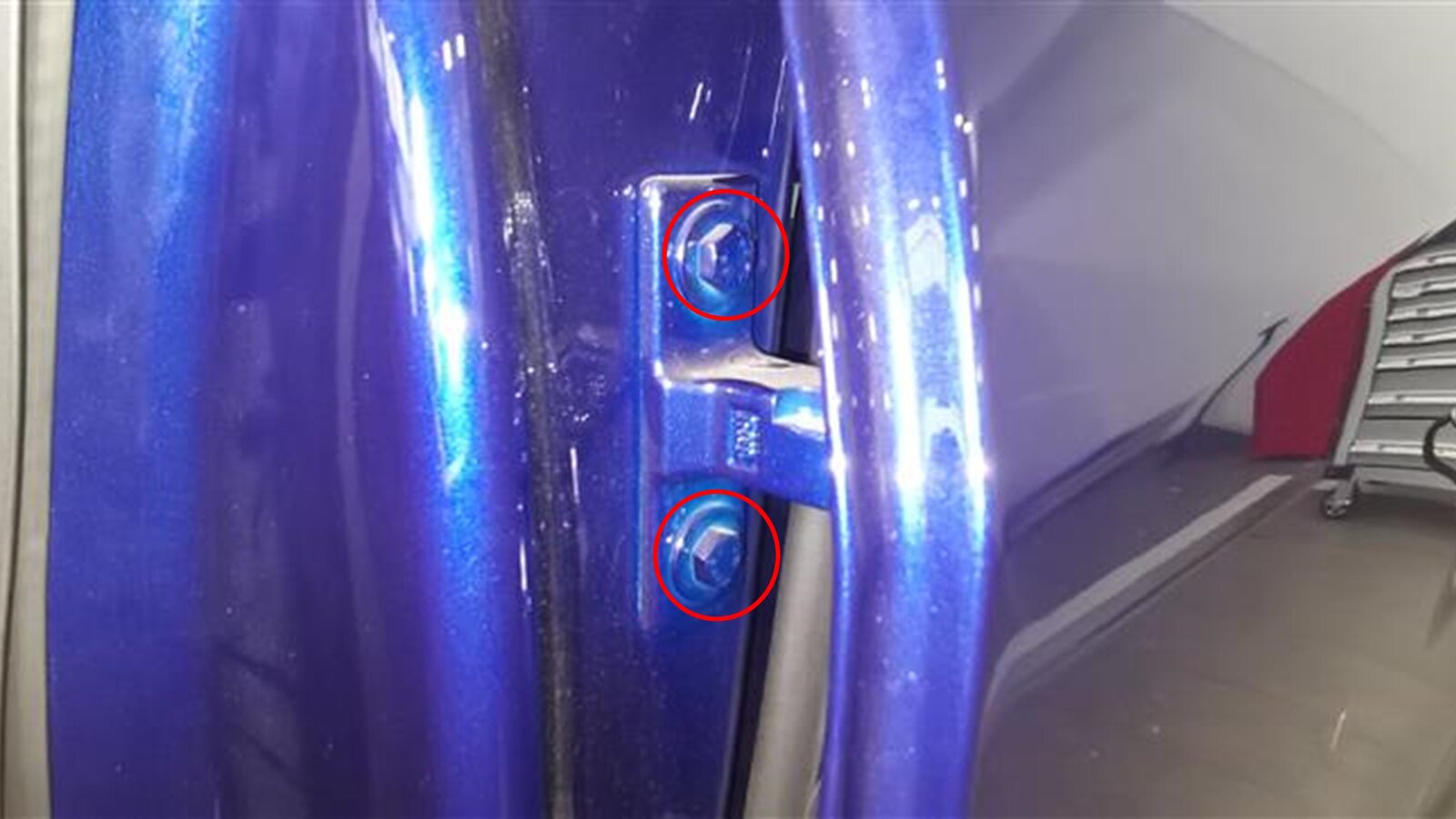 the hinge to the door, if loosened for door adjustment.