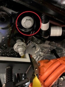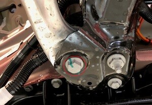 Torque the LH smaller bolt securing the rear portion of the front subframe to body