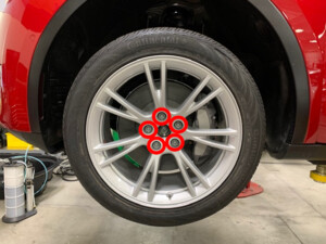 - Install the hub jack adapter onto the LH front hub and hand-tighten the lug nuts.