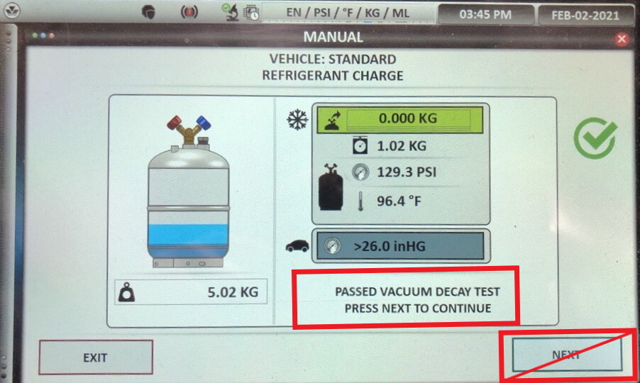 - The A/C machine will pull vacuum for 5 minutes, perform a vacuum decay test for another 5 minutes, and then perform a pressure test.
