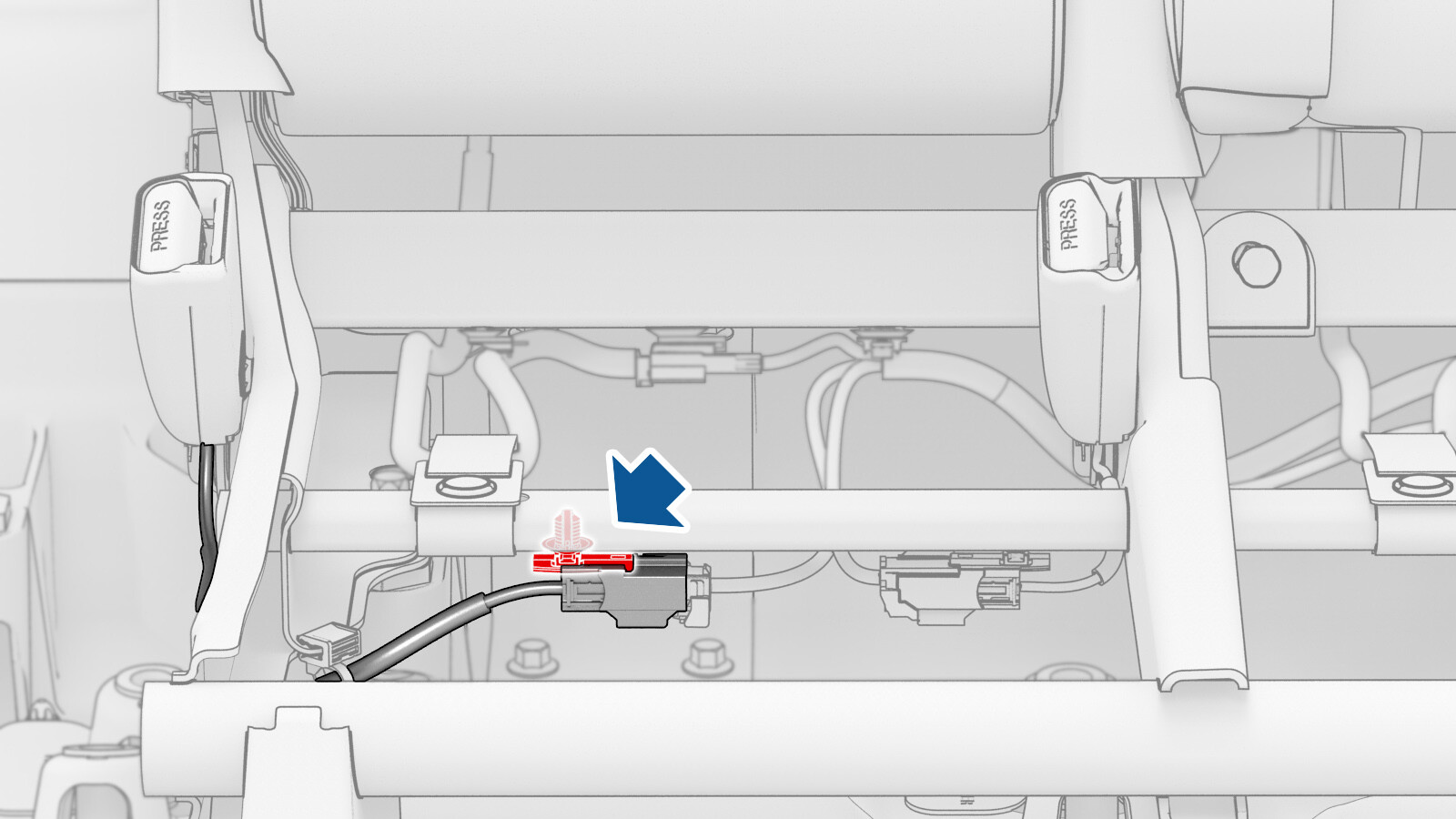 - Connect the center buckle connector to the LH seat frame harness.