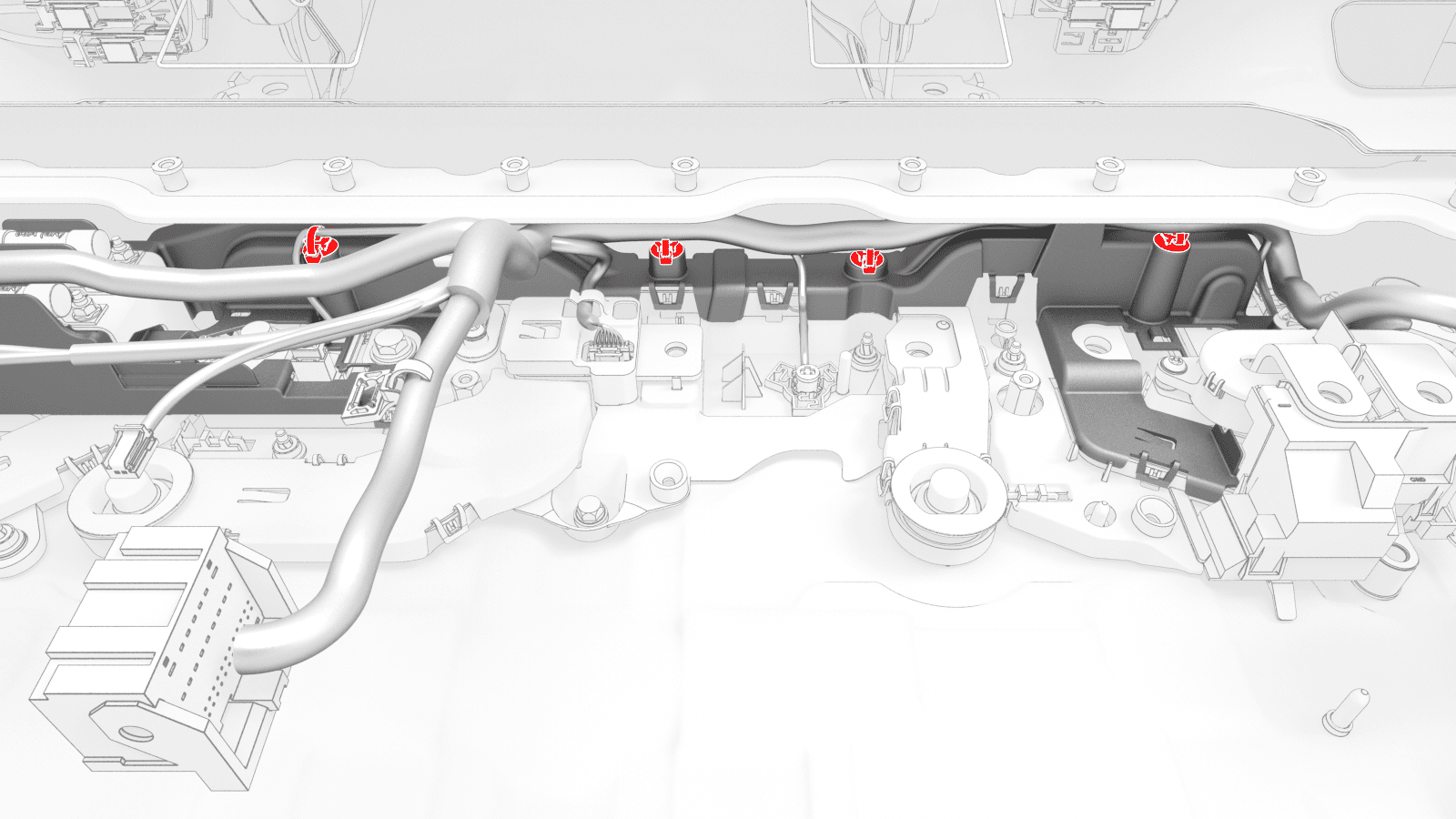 - Release the clips (x4) that attach the HV battery ancillary bay harness along the busbar insulator.