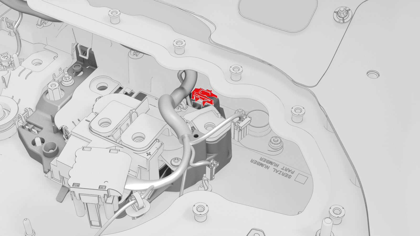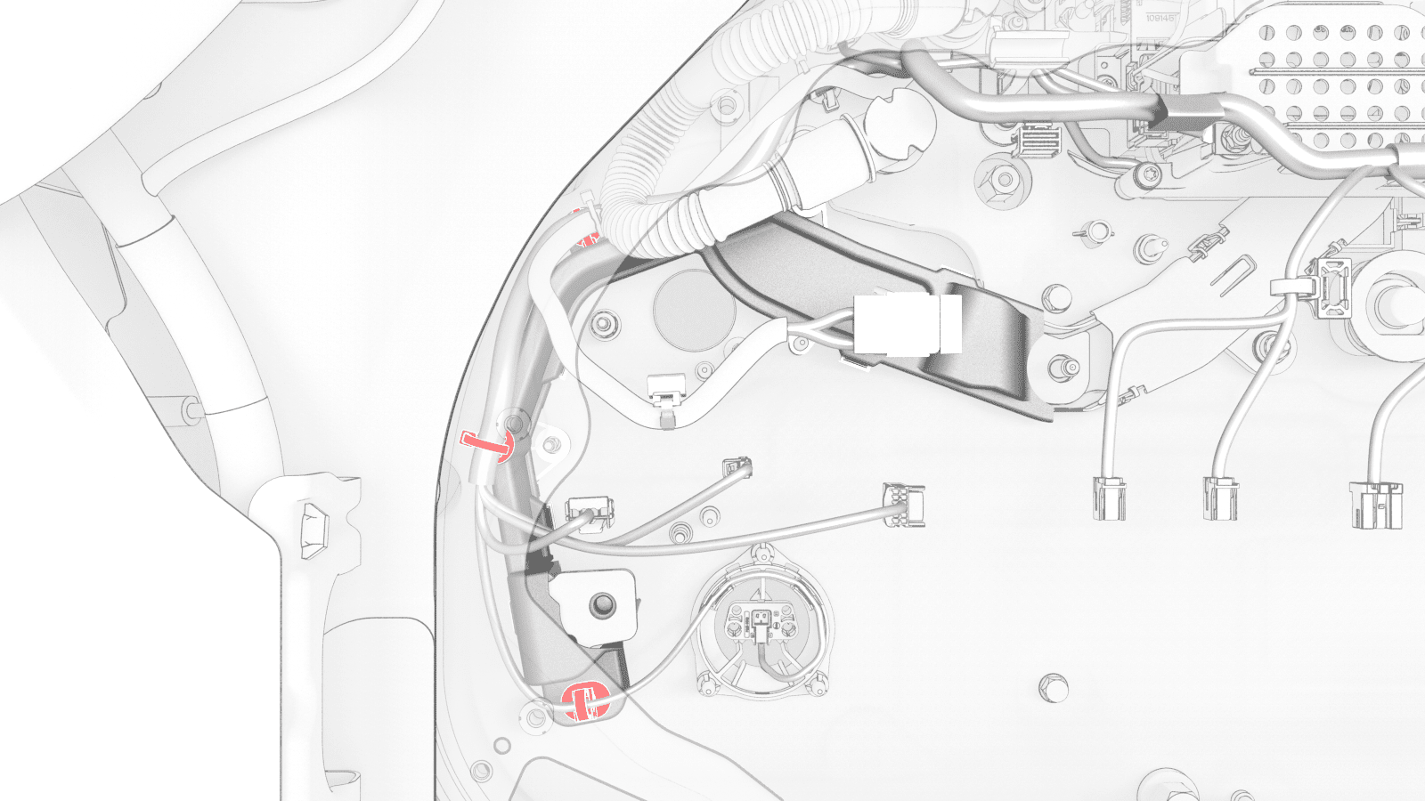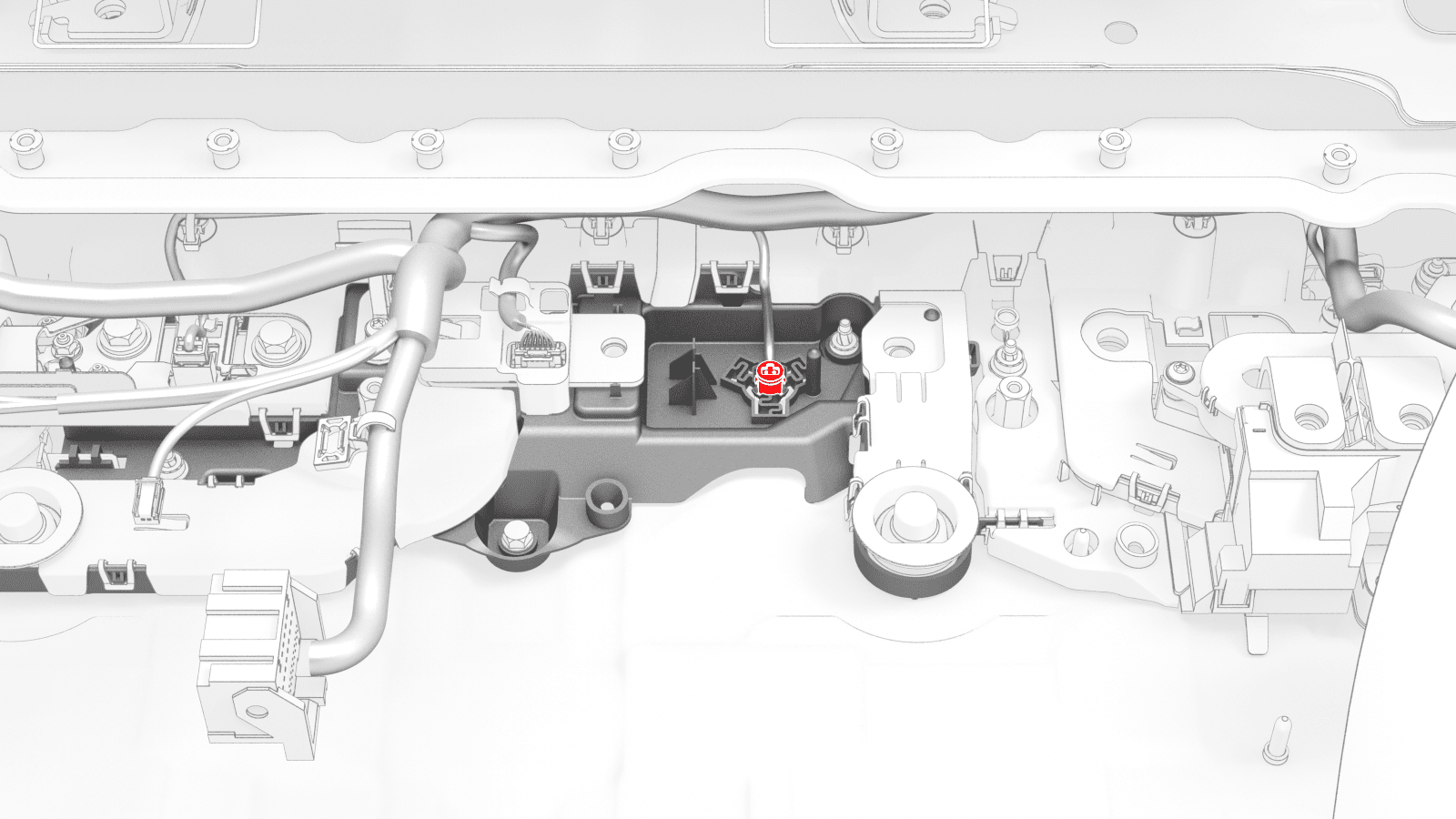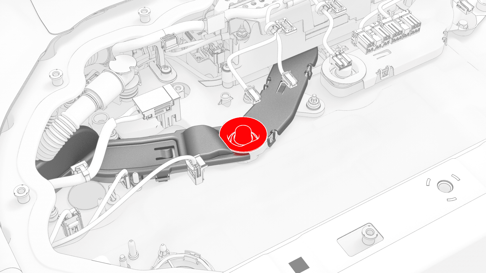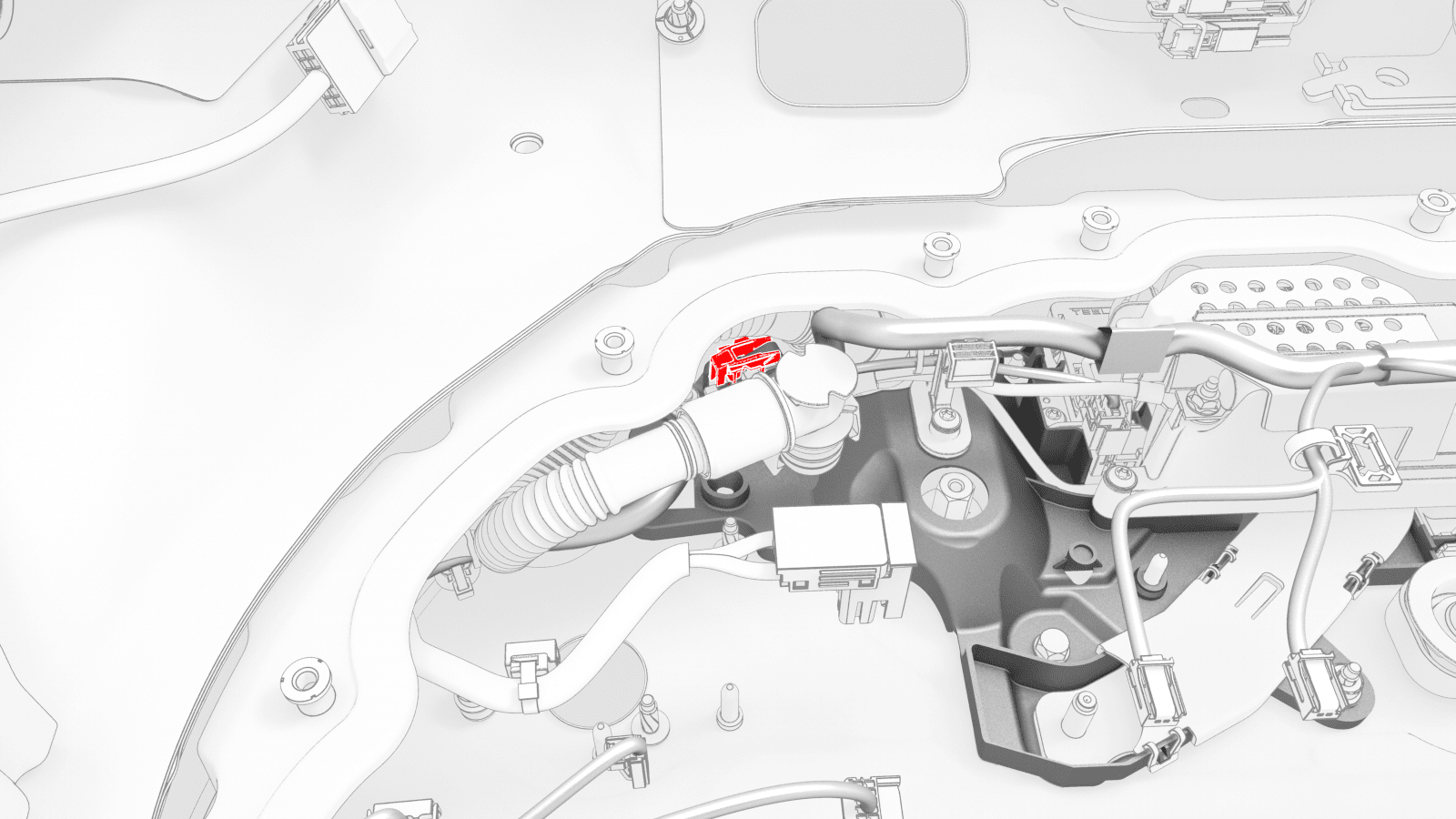 - If the vehicle is configured with dual motors, release the HV battery ancillary bay harness from under the tab, and disconnect the harness from the front drive unit high voltage interlock loop connector.
