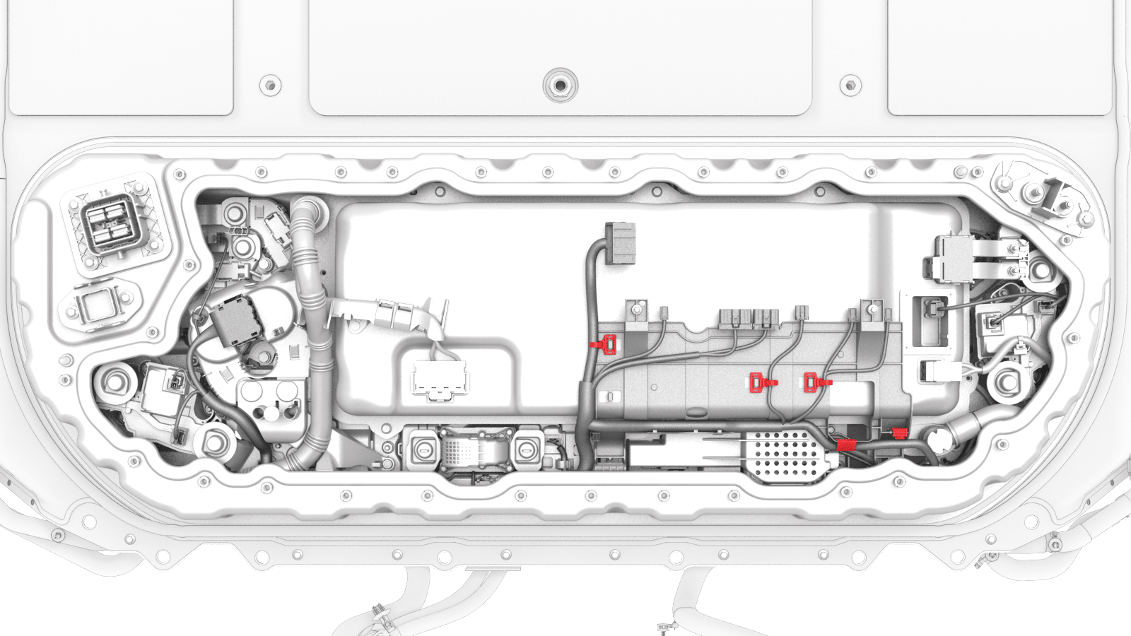 - Release the HV battery ancillary bay harness from under the respective tabs, and disconnect the harness from the A/C compressor and PTC heater high voltage interlock loop connector , the rear drive unit high voltage interlock loop connector, and the shunt connector.