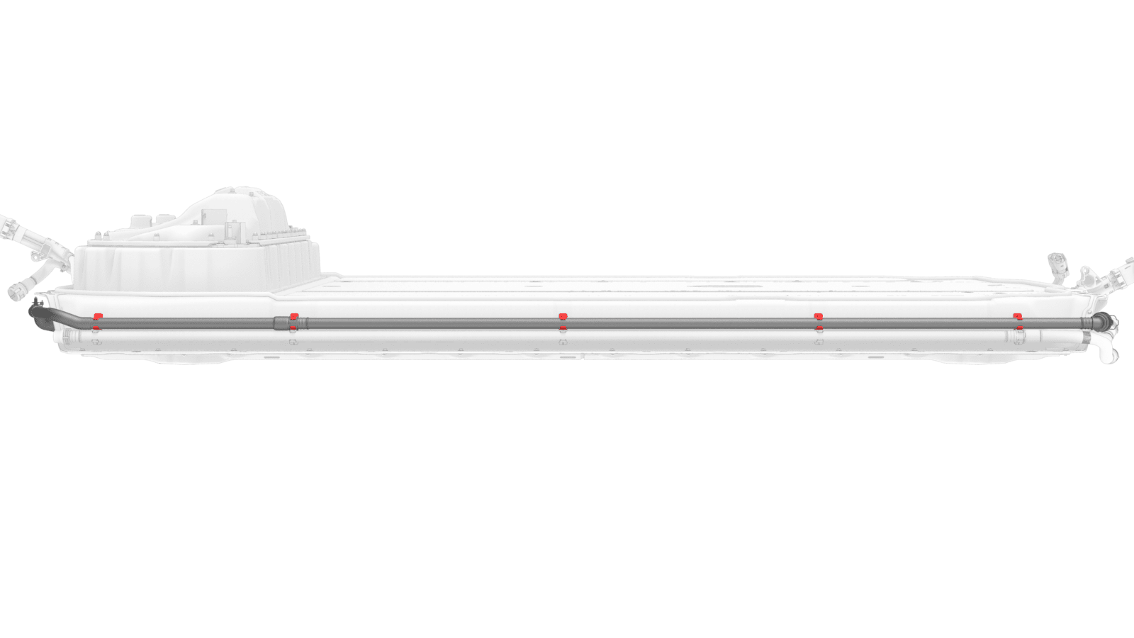 - Fasten the clips that attach the HV battery front manifold hose to the body.