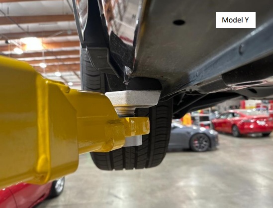 WarningDO NOT use any other lift pad adapters.NoteOutside of EMEA, Universal Lift Pad Adapters (1936724-00-A) replace Adapter, Lift Pad, Model Y (1614078-00-A). Discard any other versions of lift pad adapters.NoteIn EMEA, the Universal Lift Pad Adapters are not yet available. Make sure to use the rubber Model Y lift pads on Model Y and the Model 3 lift pads on Model 3.Instructions for Universal Lift Pad Adapters: