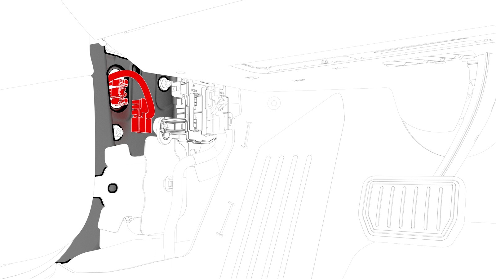 - Release the grommet, and then push the door wiring harness through the A-pillar bulkhead.