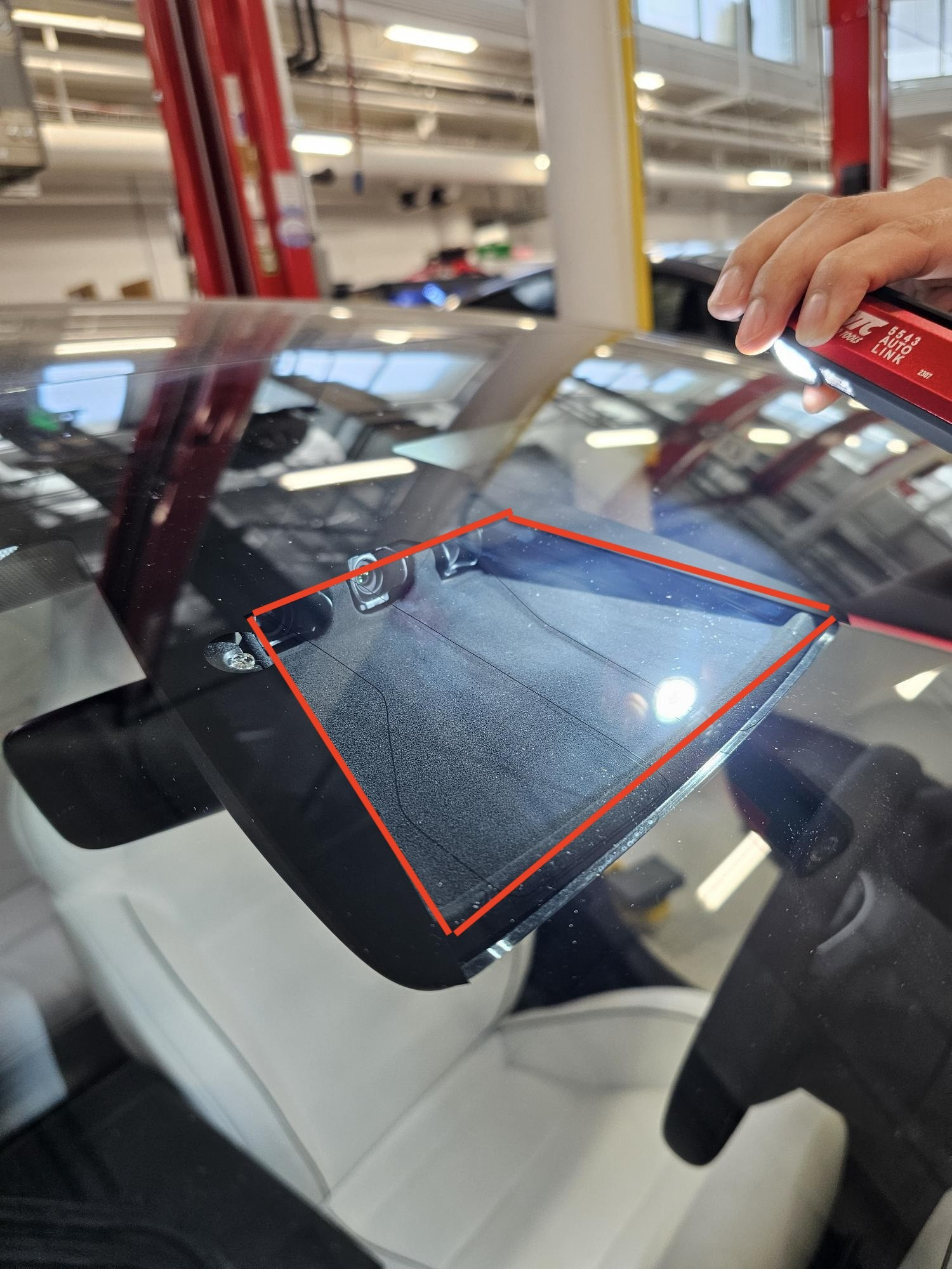 Use an LED flashlight to illuminate the outside surface of the windshield in the forward facing camera area, inspect for presence of any haze, fogginess, stains and residue on the inside of the windshield. Hold the flashlight towards you as shown in the images.