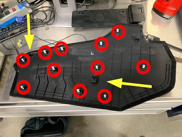 Note11x clips, 2x guide pins, Use trim tool starting at top edge to release upper clips, then pull bottom to release remaining clips, Use caution and pull panel straight away from console, if panel is peeled off it could be damaged