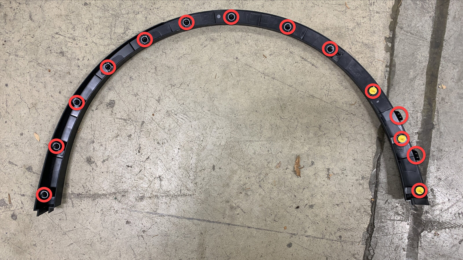 Note1x push clip, 11x clips, Guide front clip stanchions around RH C-pillar