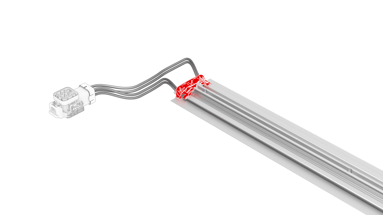 1. Install the PTC heater and A/C compressor electrical harness into the sides of the HV battery center rail ski.