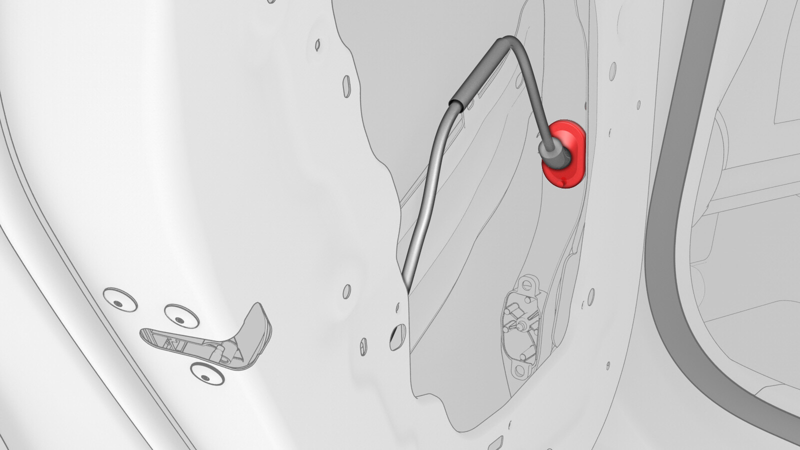 - Position the LH rear door harness into the door assembly, and then install the rubber grommet into the inside of the LH rear door.