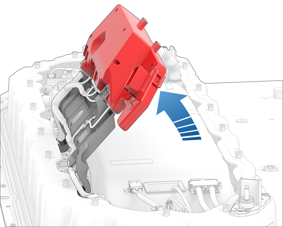 - Raise the locking tab on the 12V DCDC passthrough connector, and then remove the connector from the power conversion system.