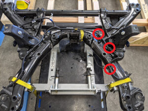 - Secure the clips (x3) that attach the front drive unit harness clips on the LH side of the front subframe.