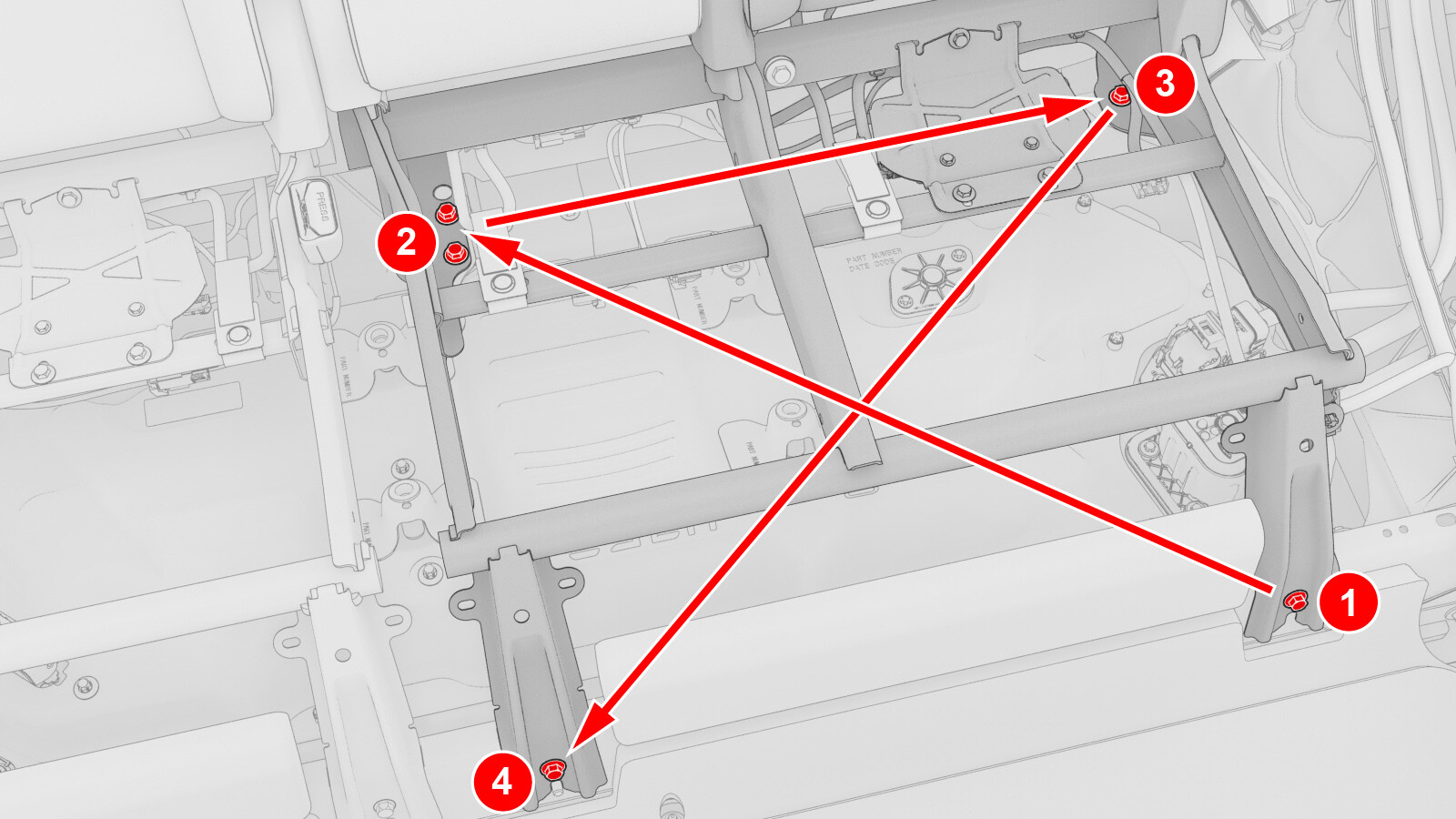 37 Nm (27.3 lbs-ft)NoteThe two frontmost bolts are behind the main carpet.NoteTorque in the sequence of:- Front Outboard