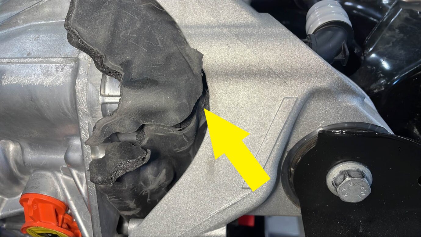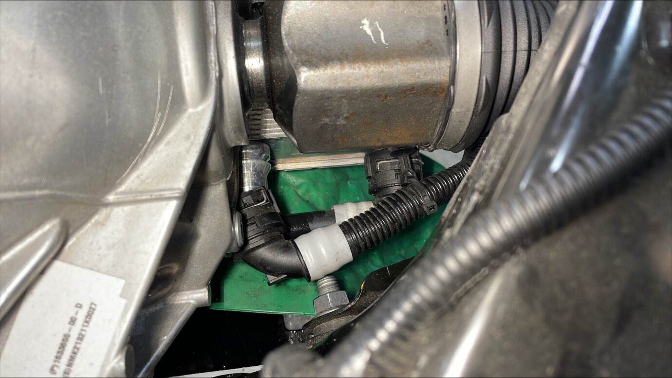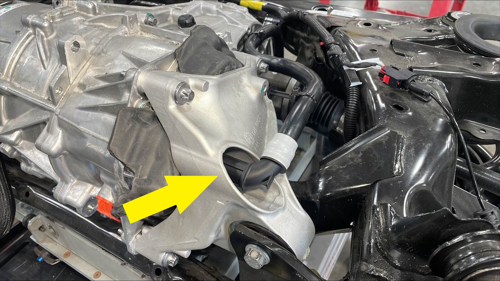 - Remove the rear drive unit inverter inlet hose down and out from between the rear subframe and the HV battery.