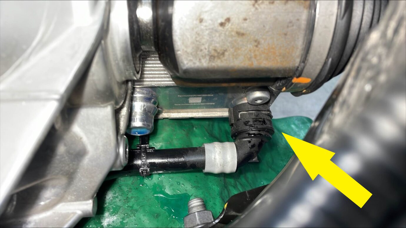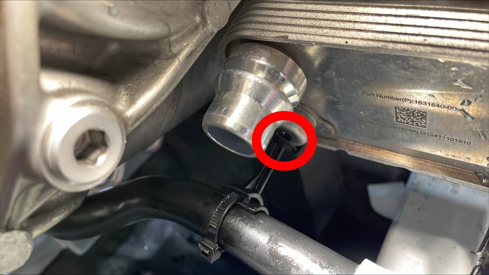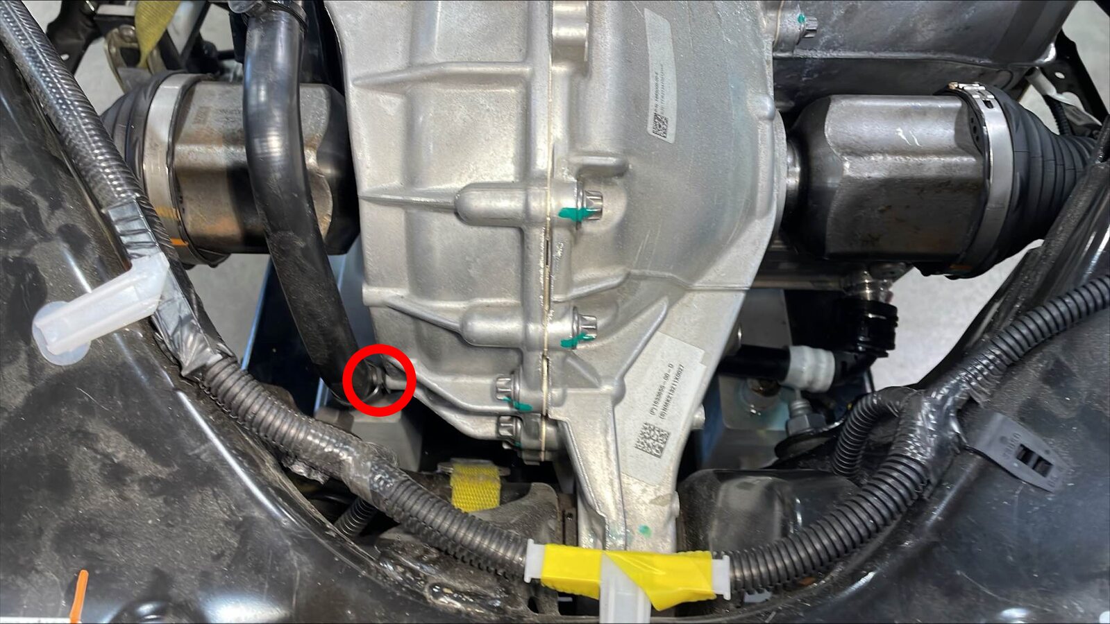 - Release clips (x3) that attach the rear drive unit coolant outlet hose to rear drive unit, and then manuever the hose out from between the drive unit and rear subframe.