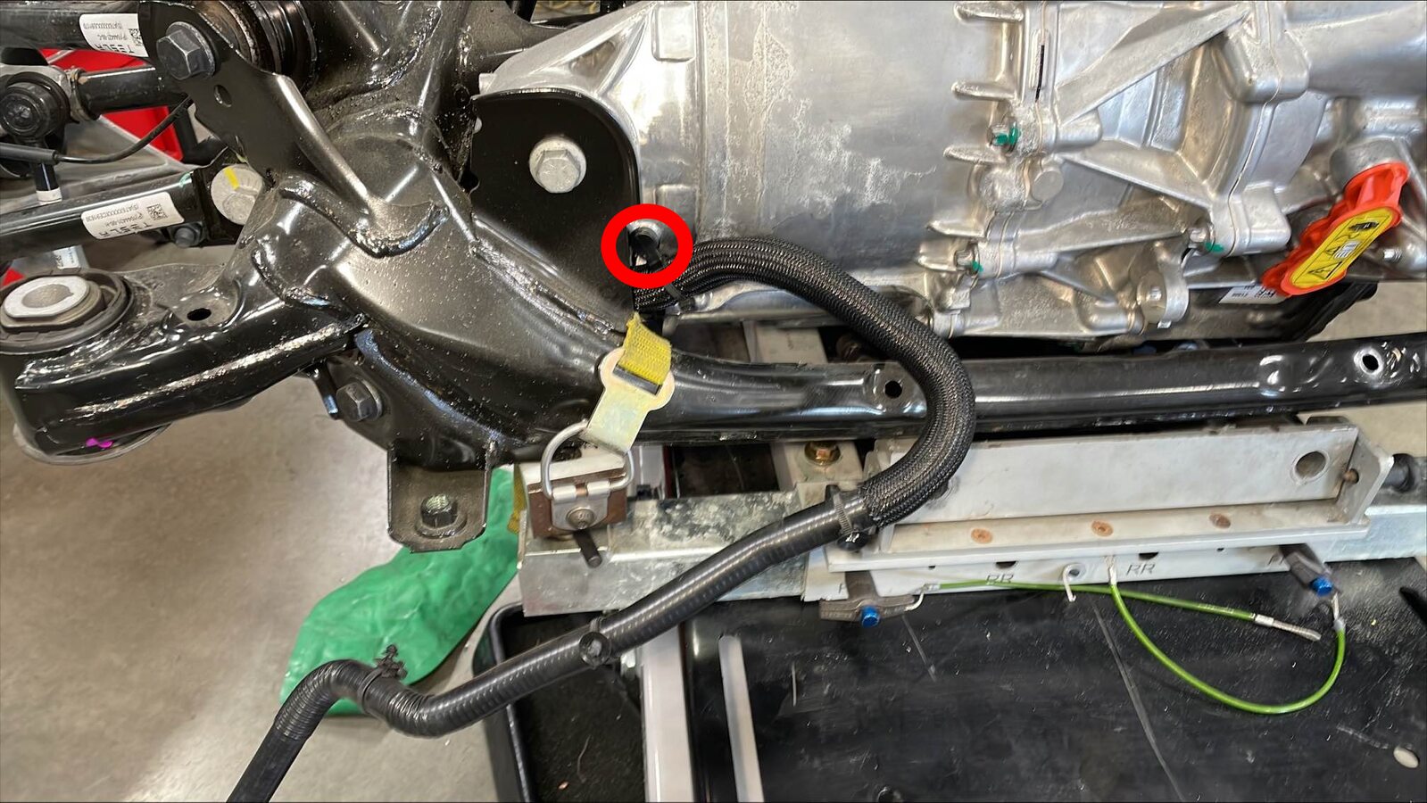 - Fasten the clip that attaches the rear subframe harness to the body on the RH side.