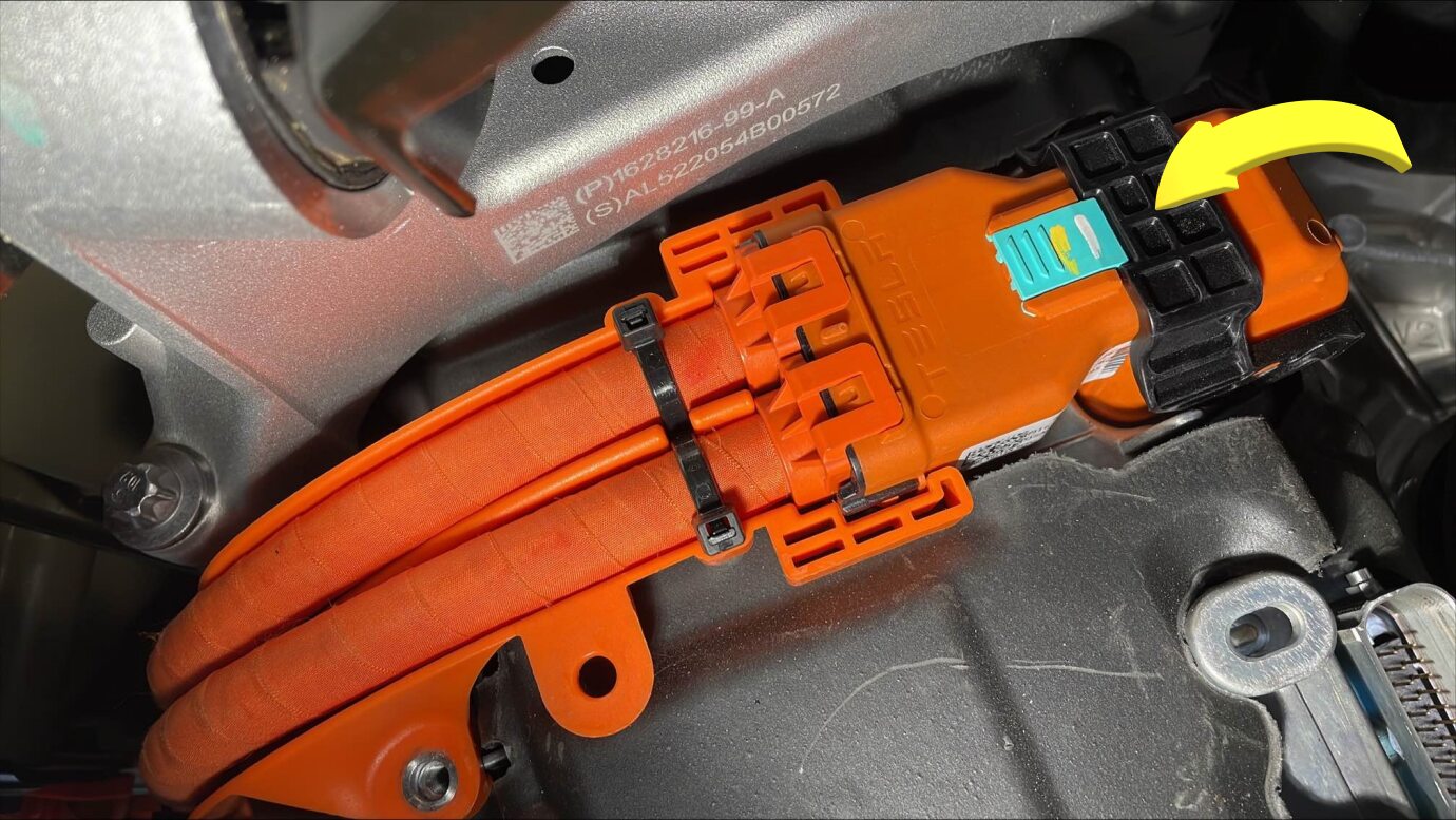 - Slide the locking tab, raise the black handle, disconnect the rear drive unit HV harness from the rear drive unit inverter HV header,and then set the HV harness aside.
