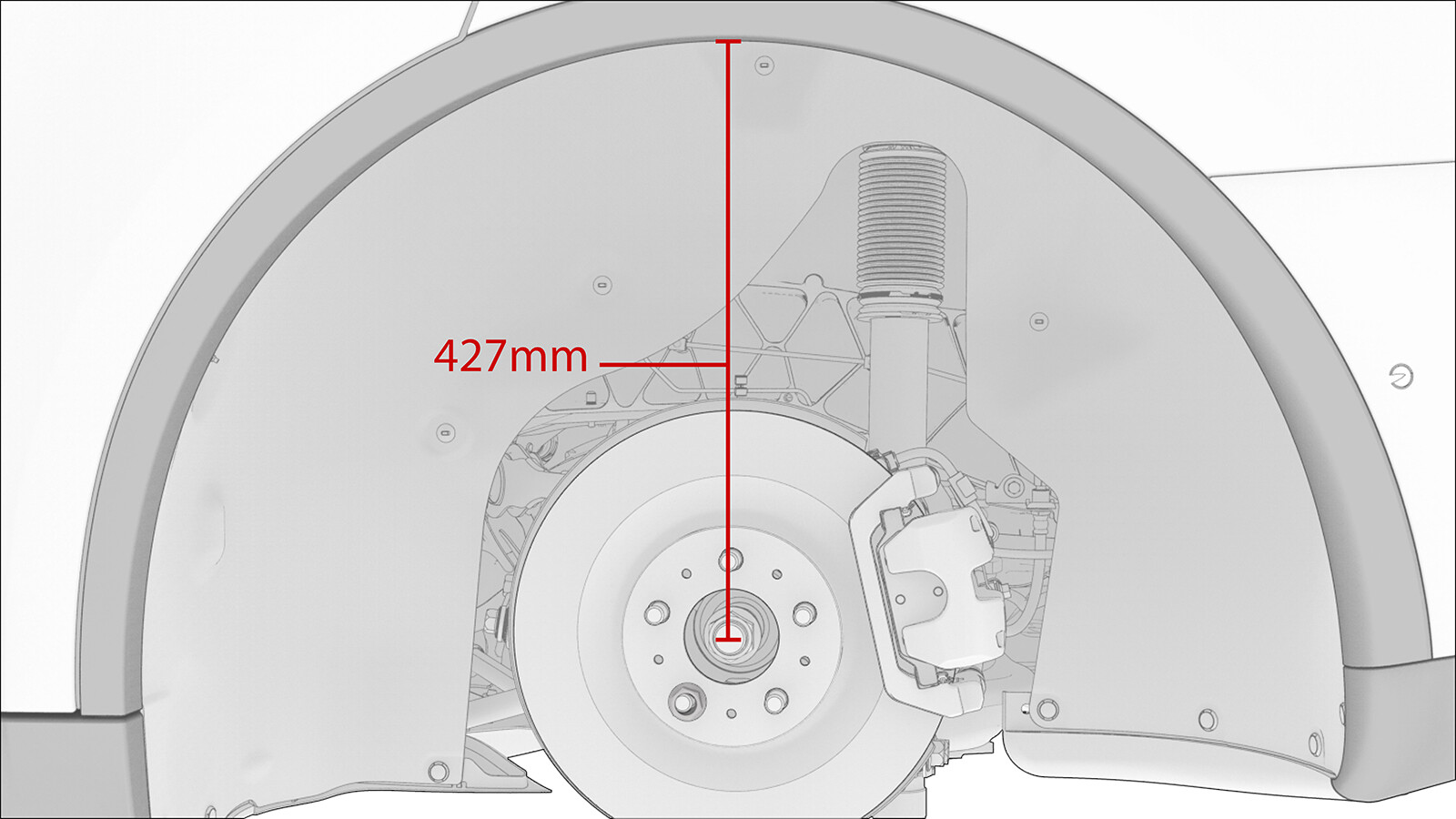 - Measure the distance between the bottom of the quarter panel and the center of the rear axle to make sure that the rear suspension is set to ride height. The distance should measure 427 mm.