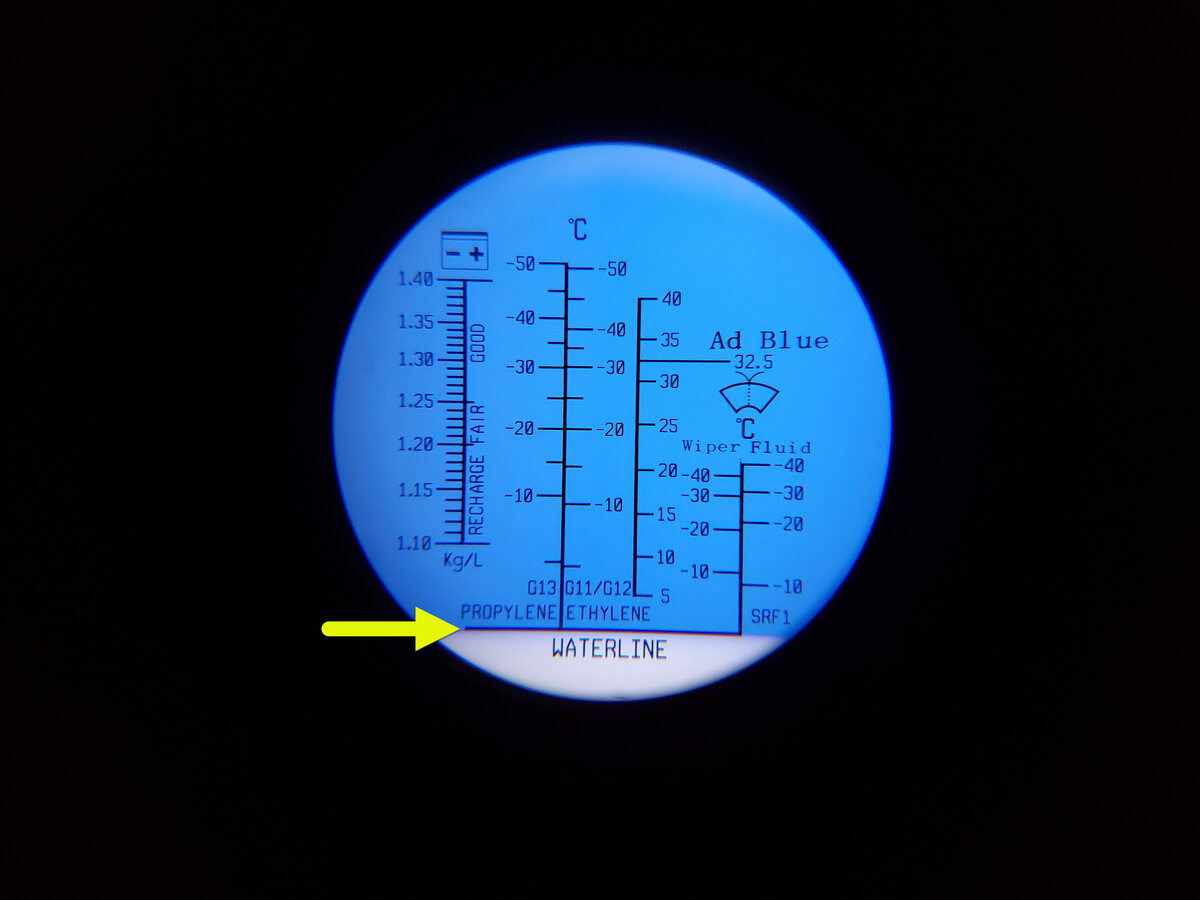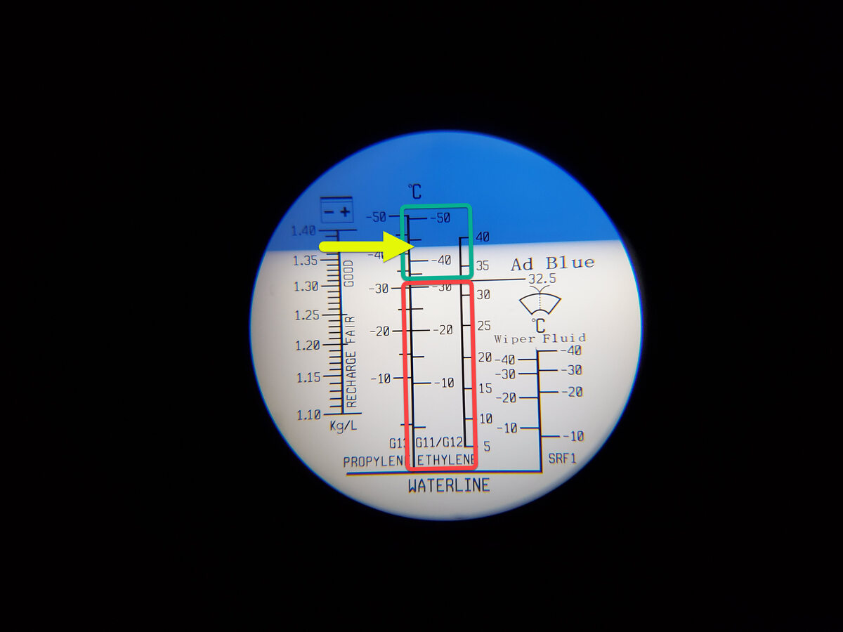 - If the lower white field is at -32 degrees Celsius (-26 degrees Fahrenheit) or colder, then the coolant freezing point temperate is within specifications. Continue to the next step.
