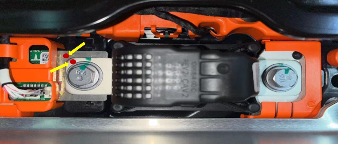 Measure the voltage between the busbar (left) and shunt (right) for at least 10 seconds, so as to balance the voltage across the pyrotechnic battery disconnect mount points.