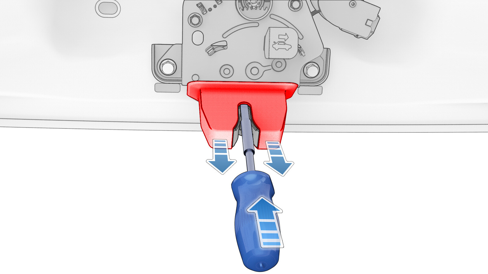 - Insert a small flat head screwdriver between the latch and latch cover, as illustrated, and then gently pry the latch cover away from the latch.