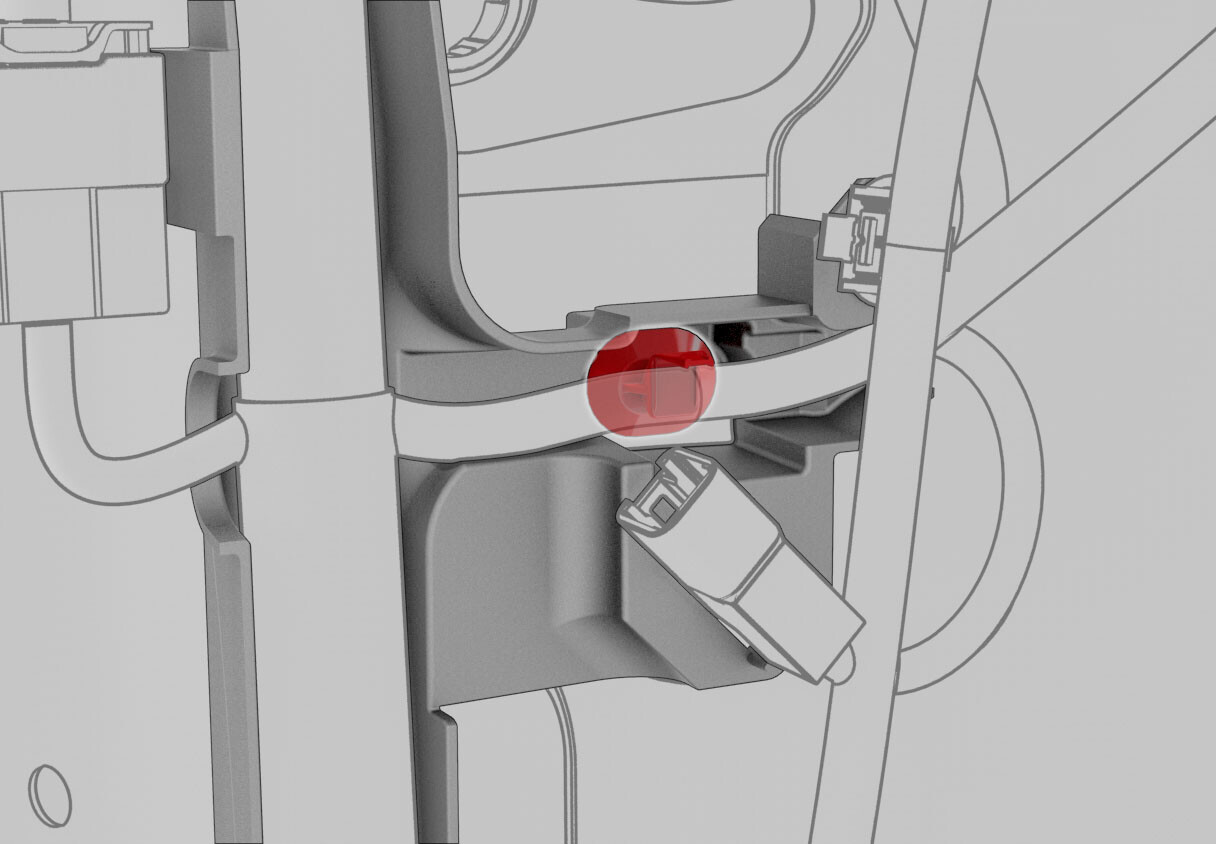 - Release clip that attaches the front wiring harness to the LH body controller module.