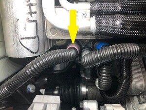 - Release the spring clip, disconnect the radiator outlet hose from the supermanifold, and then plug the supermanifold.