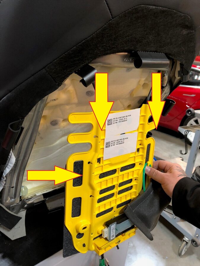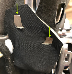 - Pull the flaps straight up off of the retaining tabs to release the flaps that cover the outboard corner of the front passenger seat back frame.