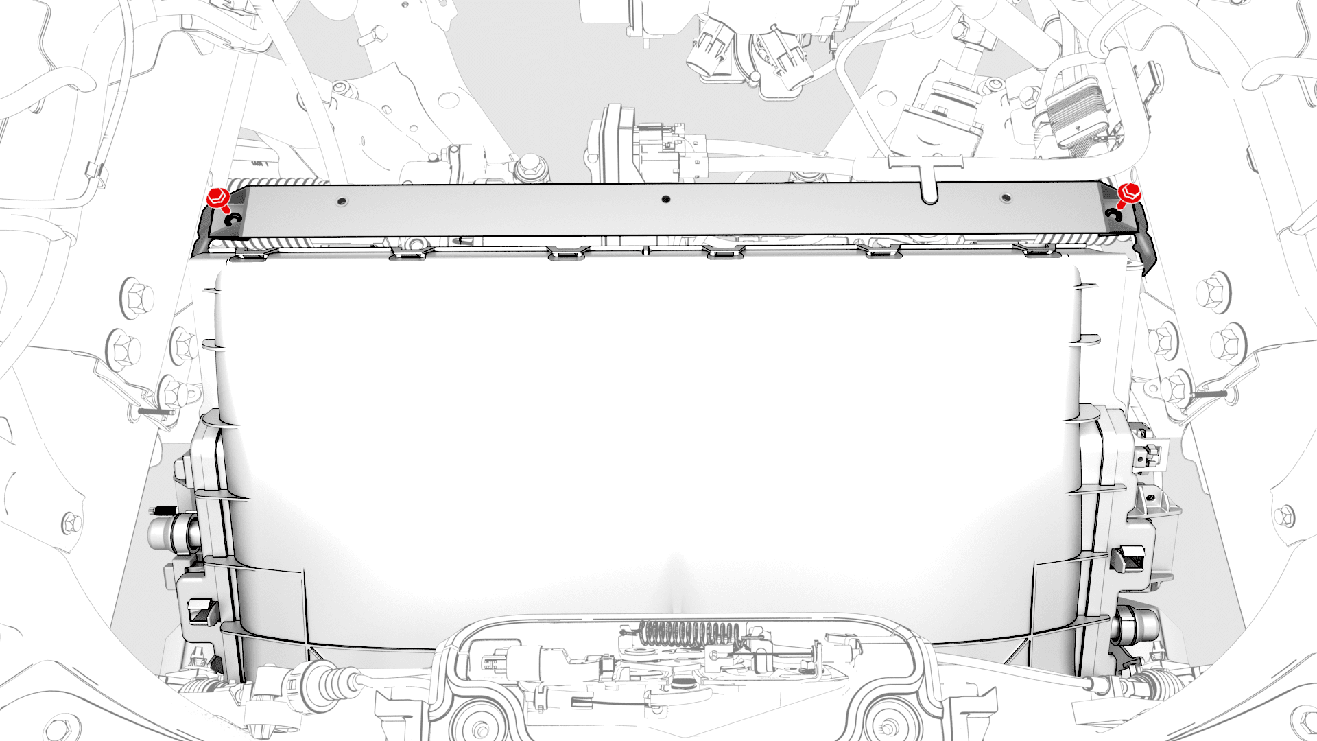 | Bolts that attach the lower LH and RH of the cooling fan module to the ankle catcher |