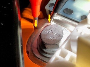 Bolt that attaches the negative pack contactor to the DC link busbar joint Nut that attaches the negative pack contactor to HV battery tall silicon terminal |