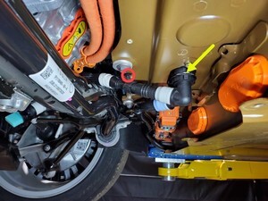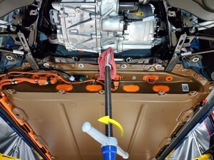 - Position coolant drain container underneath LH rear of HV battery
