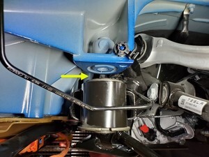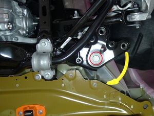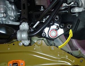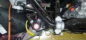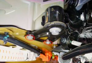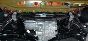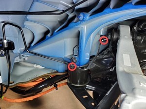 Loosen large bolt securing RH shear plate and subframe to body and rotate shear plate clear of HV battery