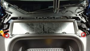 Note2x bolts, 10mm, 5 Nm, Pivot forward edge down past frunk assembly, then carefully move rear edge past brake reservoir and into position