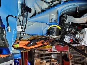 Loosen large bolt securing LH shear plate and subframe to body and rotate shear plate clear of HV battery