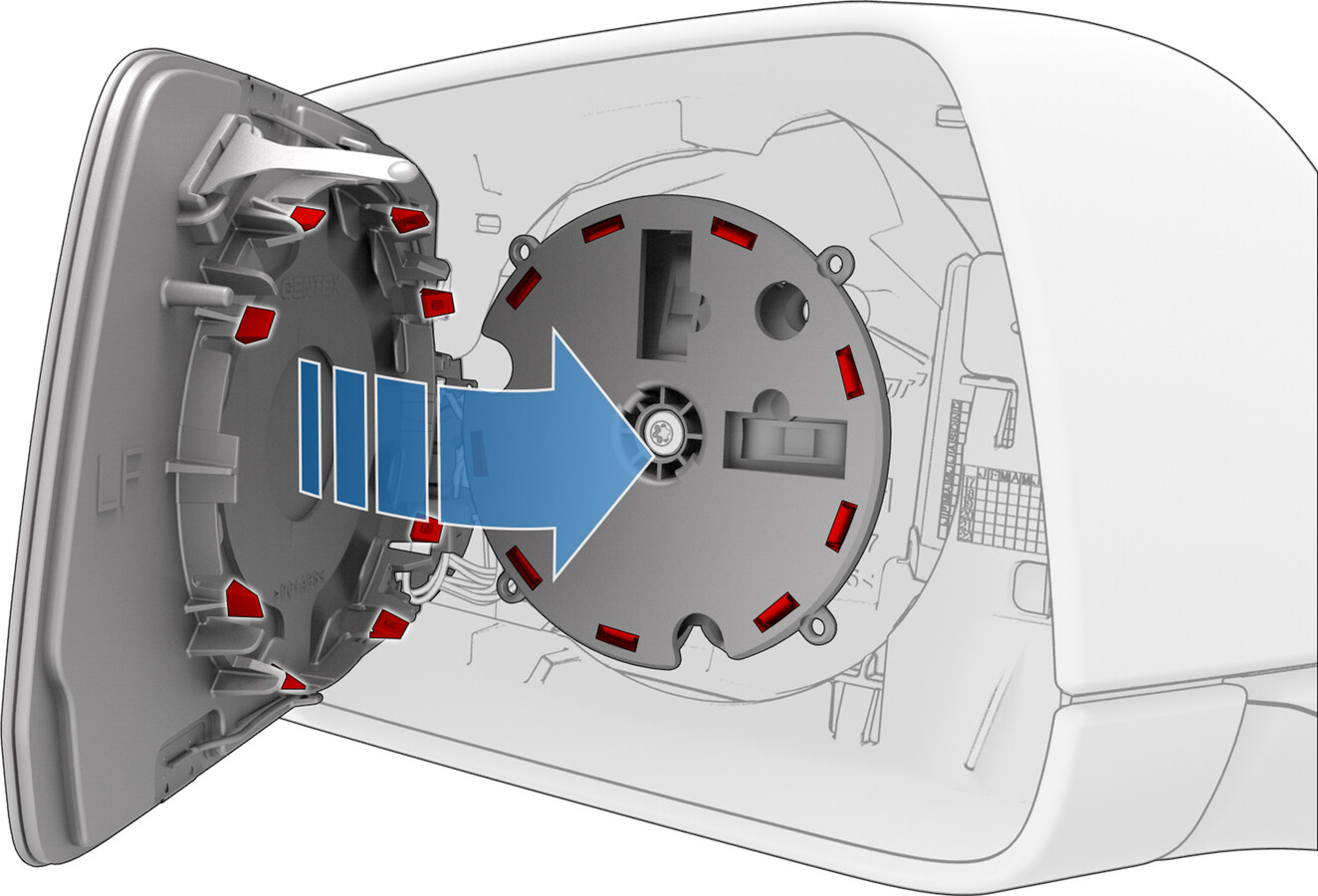 NoteWhen aligned correctly, the metal tab on the door mirror glass goes the top right of the door mirror assembly.CAUTIONTake care not to damage component(s).