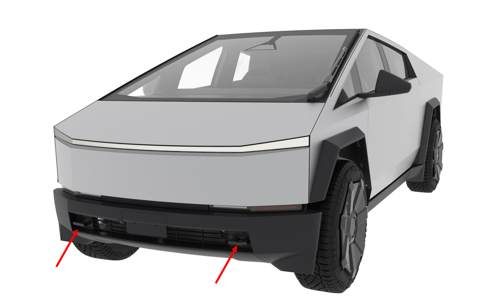 Pictured below are the Cybertruck's front towing hooks. They allow the vehicle to be towed or winched from the front, or for the Cybertruck to pull another vehicle out of the ditch using them. There are 2 square hooks provided on the dual and tri-motor variants, they are bolted onto the front subframe and are removable. On the base variant there is 1 tow hook eyelet provided, this threads into the front subframe when needed, and is normally stowed in the front trunk. For the dual square tow hook design, only 1 is needed at a time to winch the Cybertruck onto a flatbed, the same is true for the base variant with the single hook.