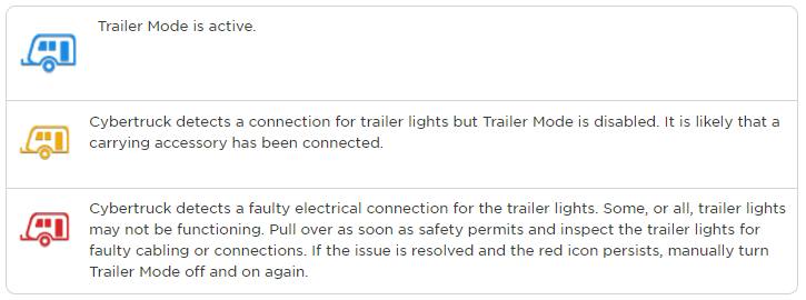The vehicle uses Trailer Mode and trailer detection to adjust behaviors, operating parameters, and functions to better suit the driving experience while towing a trailer. Trailer Mode must always be active when towing a trailer. When plugging in a trailer's electrical connection, it automatically engages Trailer Mode and the blue telltale will be lit if no electrical faults are detected. As a fail-safe, Trailer mode is automatically enabled when the mass estimate of the truck reaches towing mass thresholds, in case the user forgets to connect the lights. When unplugging a trailer's electrical connection, the vehicle will display the red telltale indicating an electrical fault. This is expected as the vehicle cannot differentiate between an intentional or unintentional disconnection of the electrical connector.