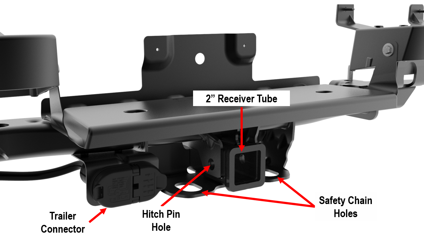 Cybertruck features a 2" rear tow hitch receiver that can be used to connect a trailer ball to tow a trailer. The receiver tube has a pinhole used to secure the receiver and tow ball. There are 2 holes used to install safety chains while towing, or they can be used to winch the vehicle from behind.