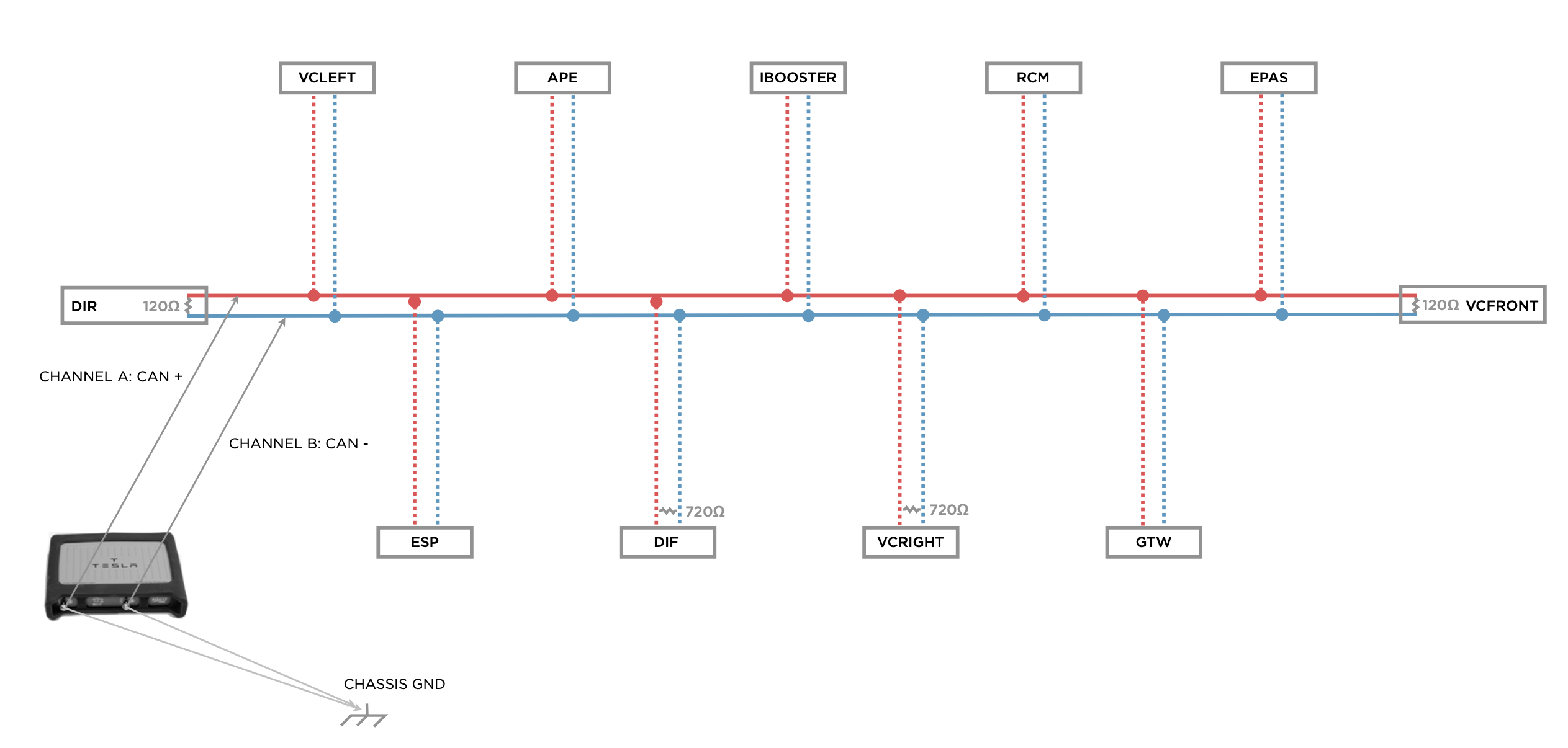 - Description: Left body communication network that connects the Vehicle Security (VCSEC) module and the Left Vehicle Controller (VCLEFT) to the left-side door handles.